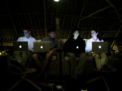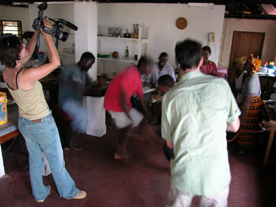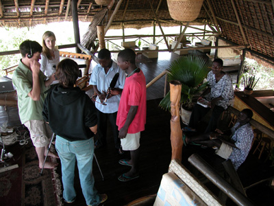 We have our first full day of being the only guests on the island. It is fantastic to have full run of the facilities. We follow up breakfast with some more recording sessions. Julius has brought out some of the other staff and they have fashioned a shaker out of a cooking oil can. After a dozen songs and some instrument solos, they take a break to go fetch some of their wives and to practice for the next session. We can hear the practice in the kitchen. It sounds so good that we decide to take the cameras back there. We are rewarded with a spectacular performance that feels much more natural than what we had seen previously out in the guest area.