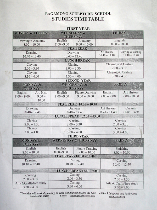 The Bagamoyo Sculpture School has a three year program and an enrollment of 45 students. Check the class schedule. The school is partly funded by the Swedish government.