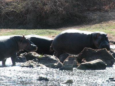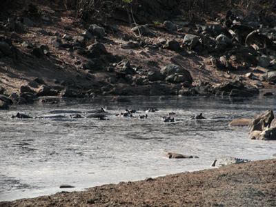 Gabriel and Julie opt out of the morning’s game drive. Chantal and I head out again with Joseph. This morning we find a bunch of hippo pools. The light is bad because the sun is behind everything, but some of the shots should turn out decent. I finally find out what has made the strange coating of plant material on several of the large rocks in camp. It turns out that when the hippos defecate, they wag their tails rapidly, thus making a coarse spay of their feces. Fascinating.