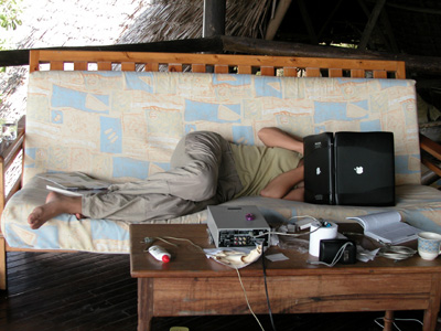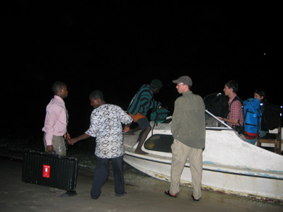 We are finally ready to go around 9:30 p.m. They have been having some trouble with the outboard motors so we are a little skeptical about actually being able to leave. Our fears are well justified as we throw the shear pin by hitting the rocks on shore as we turn the boat around to head for the mainland. Our collision with the rocks jostles another outboard motor, laying in the cabin, causing the propeller to gouge into my toes. There is a fair amount of blood, but it turns out to not be a very deep cut. We are adrift in the strong current for a good ten minutes, trying to edge our way back with frantic paddling with the kayak paddles. We manage to hold our own but don’t make any headway back to shore. Eventually one of the staff members jumps overboard and swims for it. He rustles up some line and the kayak to stage a rescue. We are a little dubious about the strength of the line. It manages to hold and we make it back to shore.