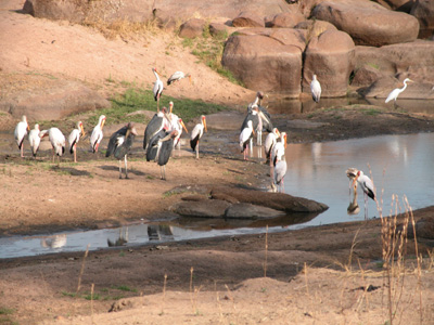 The early afternoon’s work is interrupted by the arrival of several elephants next the cabin Gabriel and I are in. We are offered another game drive at 4:30 p.m. Gabriel and Julie opt to stay in camp and edit. Chantal and I get some good shots of large group of storks, cranes and pelicans as well as a large baboon family spread out in two huge trees. Joseph finds some chunks of Euphobia (a tall cactus-like plant) near a watering hole. He is very distressed by this and explains that poachers put the Euphobia pieces in the water to kill the fish in order to harvest them. The distressing part is that a lot of other aquatic life is also killed but left to rot.