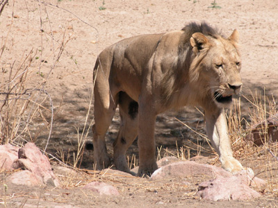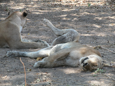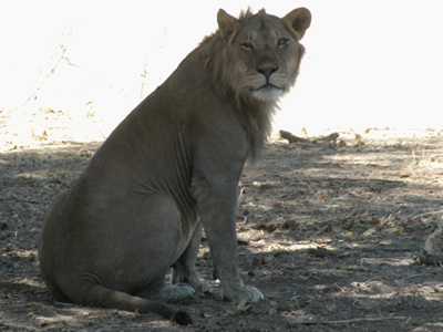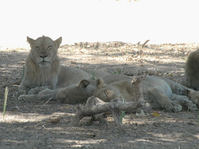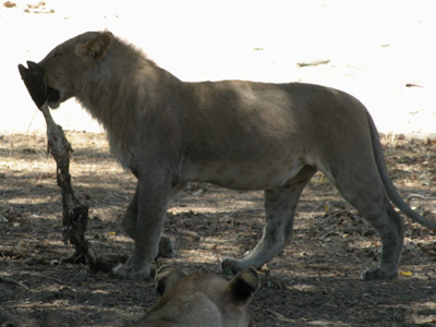 Much as I am just happy to be out here, we are in desperate need of some big cat footage for the DVD project. Amazingly, within an hour we are rewarded with a sighting of a solitary male lion in the riverbed. He is a ways off and as we drive towards his, we spot another male and a female on the riverbank. They move off into the bush as we pursue the first male. Passing a truck from another camp, our guide and driver converse with their counterparts in the other vehicle. They find that there is a large group of lions lounging on the other side of the riverbed a ways upstream. We slowly make our way over to the spot and find a group of fifteen lions lounging in the shade. They are resting after a kill, the remains of which are still being picked at by a few of the lions and a pair of vultures. We watch the group for a good half-an-hour; changing positions a couple of times for different viewing angles. We finally move on when another vehicle approaches. We drive around for another hour or so before heading back to camp for lunch.