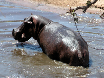 The walk is very exciting, but the game is much more wary of us on foot than in vehicles. We do manage to get fairly close to some hippos. A solitary one we come across is so annoyed with our presence that it vacates the pool it is in and tromps off in search of another. We make it back safe and sound. I really wonder how much stopping power our ranger’s breach-loading rifle has.