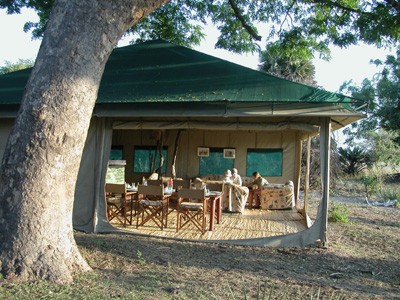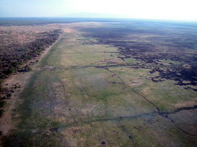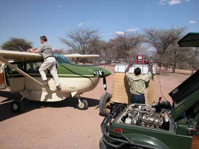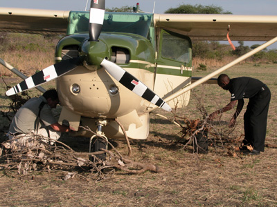 The trip tot the airfield takes an hour. We see the plane come in and we arrive just before Peter starts filling it with fuel. He needs enough to get all the way to Katavi and back. Takeoff is at 3:30 p.m. sharp. We are a bit heavy so Peter has to make a wide circle for five minutes before heading off in the right direction at the proper altitude. The view from the air is quite different. The countryside lined is scarred with countless game trails. The afternoon air is very rough and combined with a hot and stuffy cabin doesn’t make for pleasant flight. I find a semi-reclined position that is conducive to napping and try to relax. Chantal doesn’t fare as well and eventually succumbs to her nausea. Throughout the entire flight Erik reads a book. A strong tail wind hastens our journey and we touch down in Katavi an hour and forty-five minutes later.