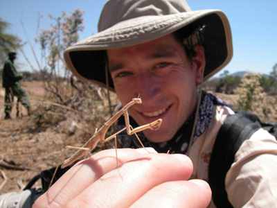Gabriel with a praying mantis. Always read the warning signs before you leave for a walking safari.