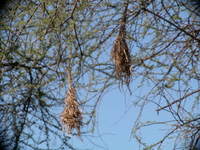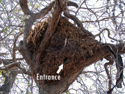 Some bird nests: weaverbird on the left and hamerkop on the right. The hamerkop nest is enclosed with a small entrance on the underside.
