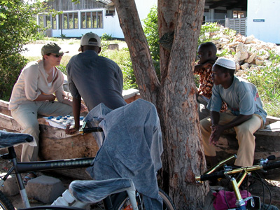 A hand operated bow-drill. Sandrine playing checkers with some of the locals.