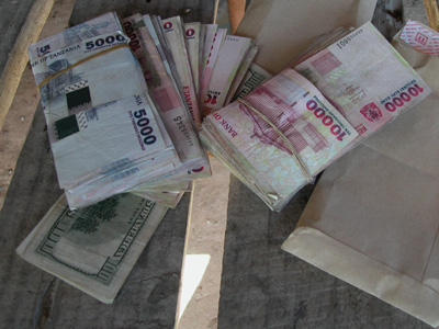 Back over at Mr. Mtana’s we were invited to climb up onto his unfinished second and third story to look out over the Dar es Salaam skyline. There is also an excellent view of the new house as well as the side of Hanif’s. We get the $3600 in rent organized before coming back down. Another long conversation culminated in Maina handing over the two envelopes with the rent money. Mr. Mtana dutifully counted through 2,600,000 in 5,000 and 10,000 Tanzanian shilling notes as well as writing down the serial numbers for the $1000 in 100 dollar bills. The lease documents were signed with a witness from each side as well. a receipt for payment was signed and we were on our way.