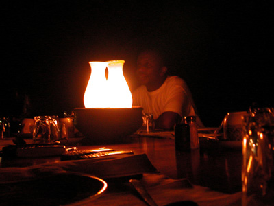 Our morning’s work done, I went back to my banda to work on the computer, read and get some relaxing in. Went a little overboard with the relaxing and ended up a little late for dinner. While I was dead to the world, a family with six kids had arrived. One of the children was particularly trying and unpleasant. Did some more work after lunch and emerged in the late afternoon to take some more photos. There was a trickle of messages from Maina the whole afternoon. Each of the messages pushed the arrival time for he and his friends back further and further. Eventually we got what appeared to be one that meant something, mentioning an arrival time of 6:30 p.m. The time came and went and a bit later we got a frantic call that they seemed to have taken a wrong turn somewhere. Chantal’s directions had been a little sketchy but the situation was corrected and they found the Fish Camp all right. A quick boat ride in the dark brought Maina, Tessa, Catherine and Josephine to the island.