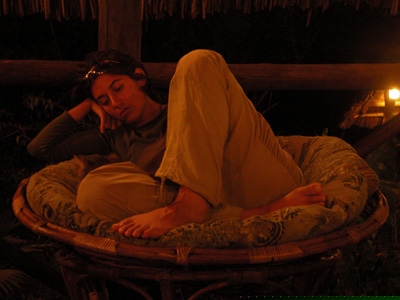 Chantal relaxing with Tiger, her new feline friend. Maina by lamplight.