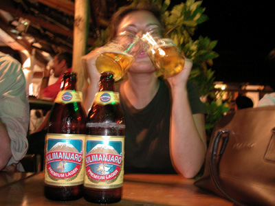 Sandrine enjoying a Kilimanjaro . . . or two.