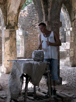 The rest of the morning was spent shooting the Great Mosque and Makutani, a palace for the sultans of Kilwa. The ruins are the oldest known Swahili settlement in East Africa. They initially date from the 13th century, with additions up to the 18th century. Eddy, the French stone carver in change of the actual restoration was on hand to show us around a bit before Pierre arrived.