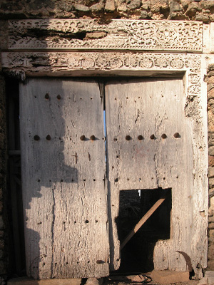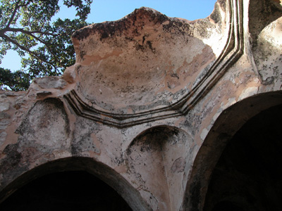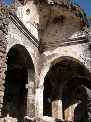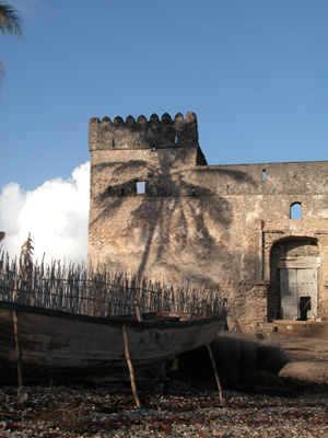 A dhow awaited us at the harbor. We scampered aboard and enjoyed the half hour trip to the island. The sky had started to clear and we could see areas of rain moving away from us. As we drew near the shore, we noticed a rainbow over the ruins of a fortress. After our gear was unloaded, Chantal and I headed off to document the fortress. As we were returning to the rest of the group, a local official approached. He had Pierre on a walkie-talkie and a long conversation in Swahili and French ensued. The upshot was that the official did not think our papers were in order and we would consequently not be allowed to film or take pictures. After further negotiations and some linguistic finagling we were allowed to shoot.